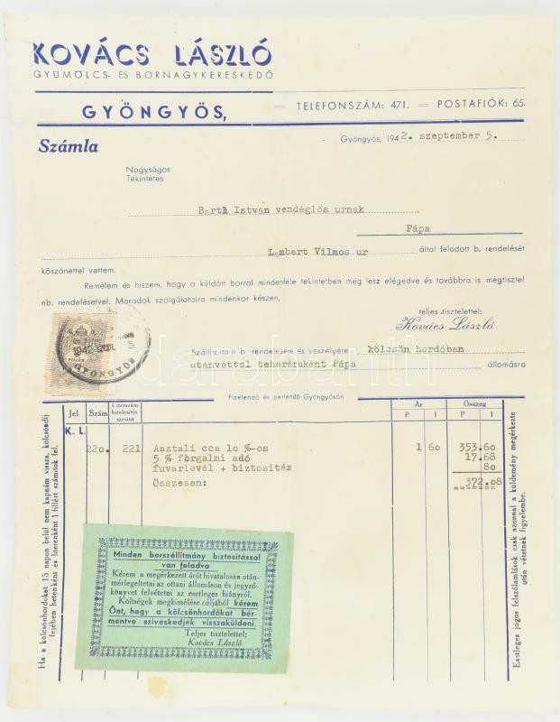 1942 Kovács László Gyümölcs- és Bornagykereskedő, Gyöngyös fejléces sz... https://www.darabanth.com/hu/445-Gyorsarveres/445.0/Mutargy-papirregiseg-egyeb/Reklam~500024/1942-Kovacs-Laszlo-Gyumolcs-es-Bornagykereskedo-Gyongyos-fejleces-szamla~II2944145