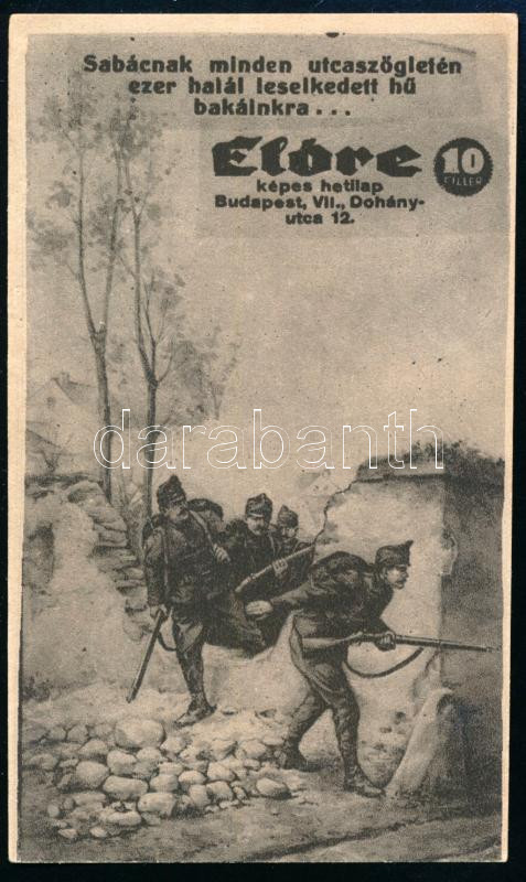 Az Előre hivatala által kiadott, katonai témájú számolócédula https://www.darabanth.com/hu/445-Gyorsarveres/445.0/Mutargy-papirregiseg-egyeb/Reklam~500024/Az-Elore-hivatala-altal-kiadott-katonai-temaju-szamolocedula~II2943050