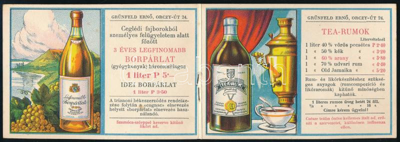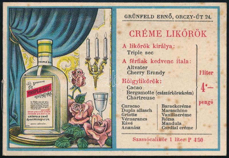 Leírás: Grünfeld Ernő krémlikőrök, Bp. Orczy út 24. árjegyzék