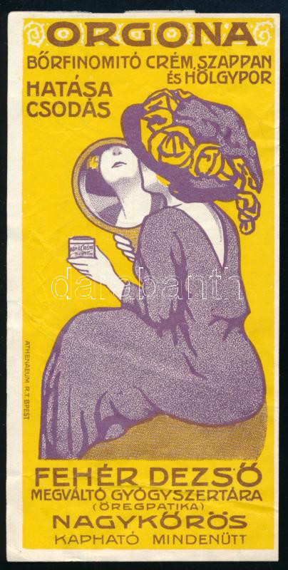 Leírás: Orgona Bőrfinomító krémet és szappant népszerűsítő számolócédula Fehér Dezső gyógyszertára által forgalmazva.