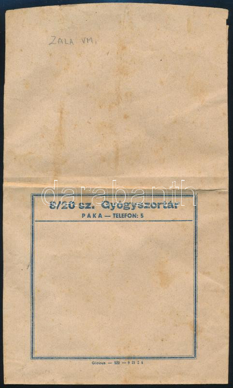 Leírás: Páka 8/20 sz. gyógyszertár tasakja, hajtott, foltos, 23×14 cm