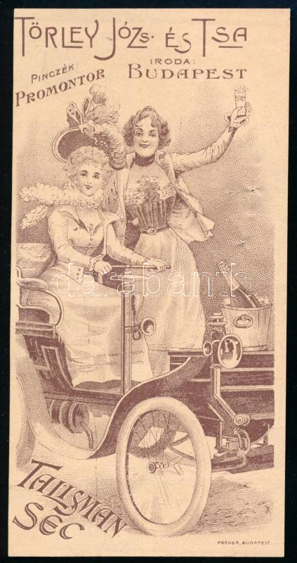 Leírás: Törley Talisman sec. pezsgő, korabeli autót vezető hölgyekkel illusztrált szecessziós számolócédula, hátulján elszámolással.