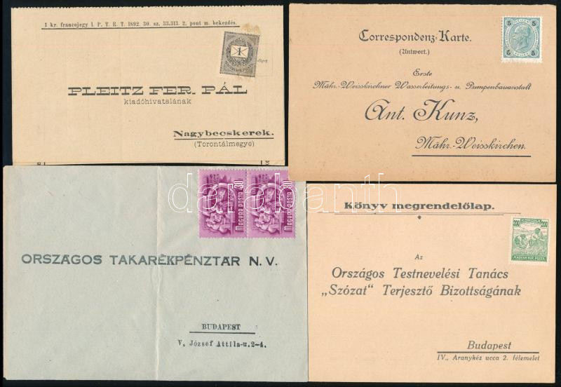 Leírás: cca 1870-1945 4 db cégbélyegzéses boríték, levelezőlap