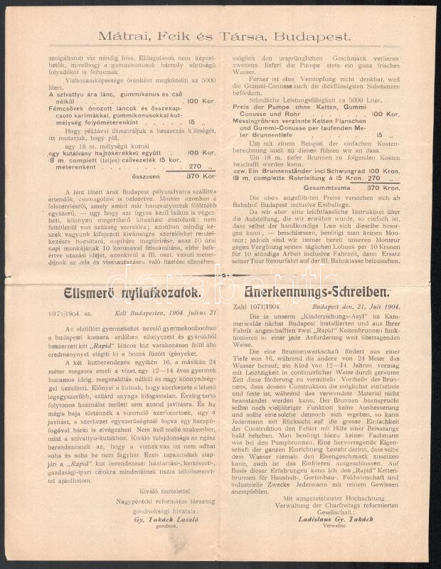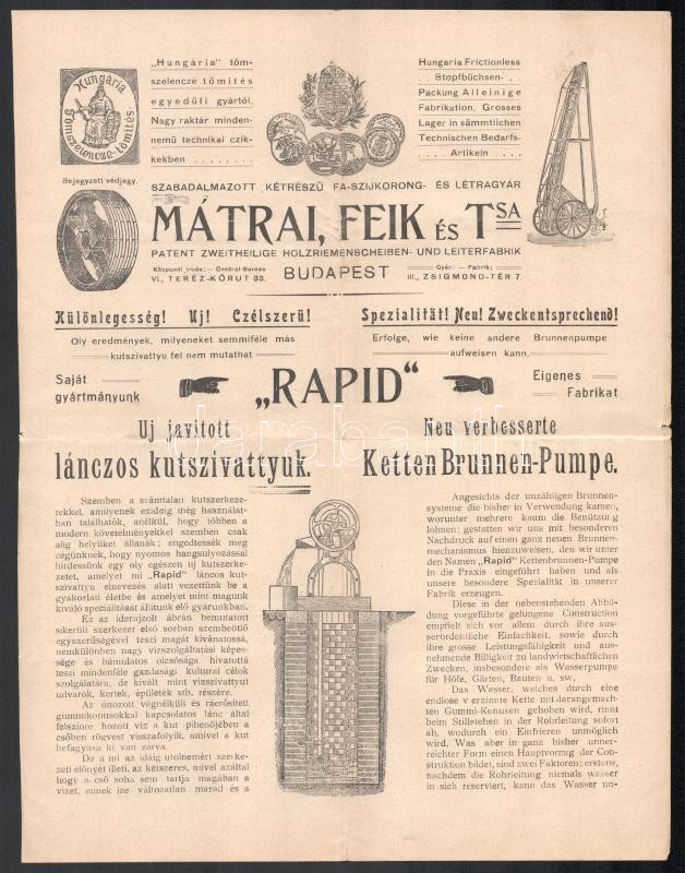 Leírás: cca 1910 Mátrai kútszivattyúk reklám nyomtatvány