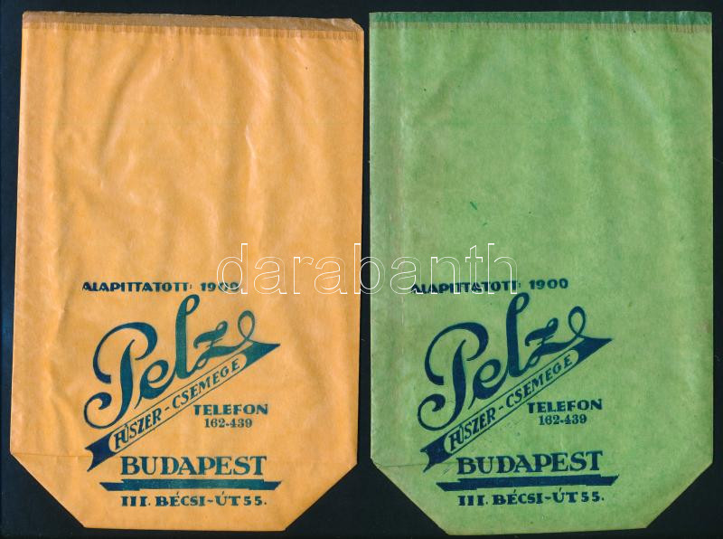cca 1930-1940 Pelz fűszer-csemege (Bp. III., Bécsi út 55.) reklám papí... https://www.darabanth.com/hu/445-Gyorsarveres/445.0/Mutargy-papirregiseg-egyeb/Reklam~500024/cca-1930-1940-Pelz-fuszer-csemege-Bp-III-Becsi-ut-55-reklam-papirtasak-2-db-kulonbozC5~II2939518