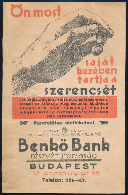 Leírás: cca 1930 M. Kir. Osztálysorsjegy főelárusító - Benkő Bank Rt. kétoldalas reklámlapja