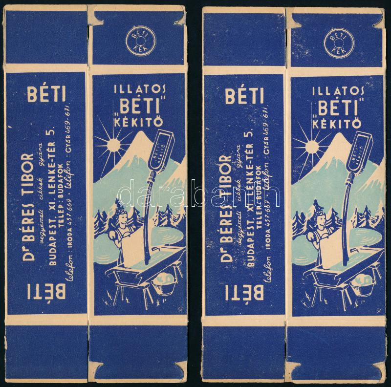 Leírás: cca 1940 Illatos "Béti" kékítő, Dr. Béres Tibor vegyészeti cikkek gyára, 2 db kartondoboz, 20,5x10 cm