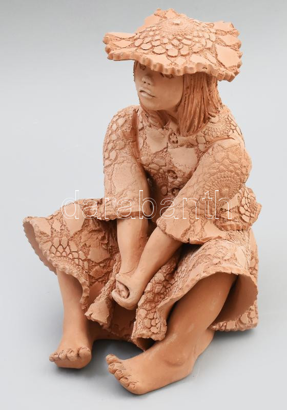 Leírás: Illár Erzsébet (1940-): Ülő lányka terrakotta szobor, jelzett m: 21 cm
