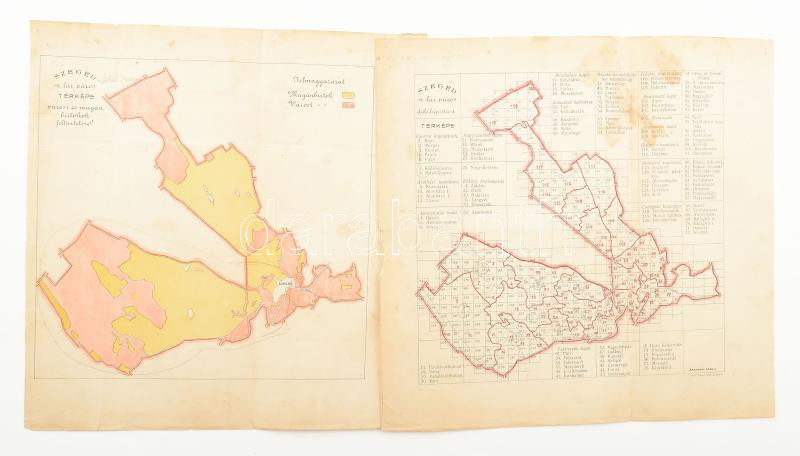 cca 1890-1910 Szeged sz. kir. város dűlőbeosztási térképe, tervezte: Jakabffy Lajos + Szeged sz. kir. város térképe városi és magán birtokok feltüntetésével. Kisebb lapszéli szakadással, foltokkal, 26x24 cm