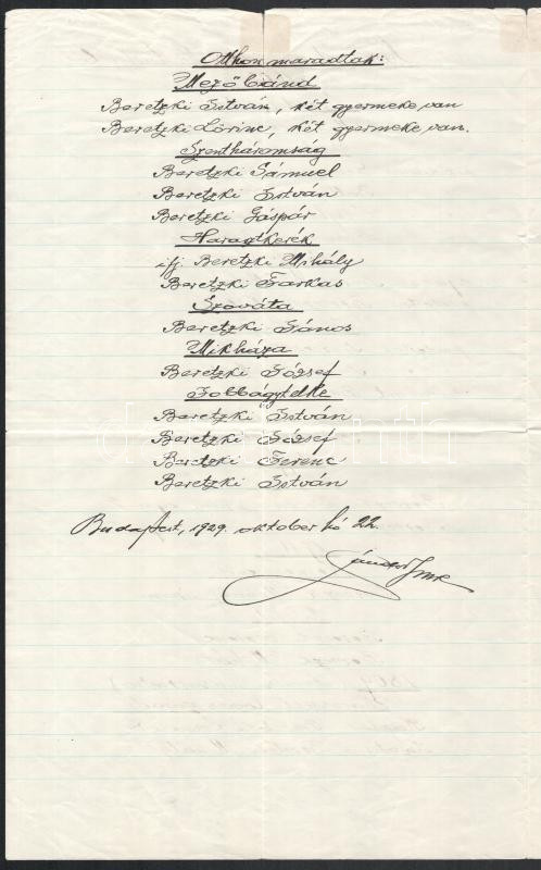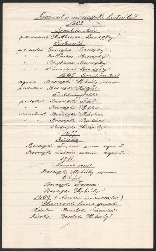 1929 "Kivonat a marosszéki mustrából", Bereczky (Bereczki/Beretzki) családnévvel rendelkező nemesek Székelyföldön (Szentrontás, Torboszló, Kibéd, Szováta, stb.), kézzel írt felsorolás 2 oldalon, Sándor Imre aláírással (csíkszentmihályi Sándor Imre (1877-1930) genealógus?), 34x21 cm