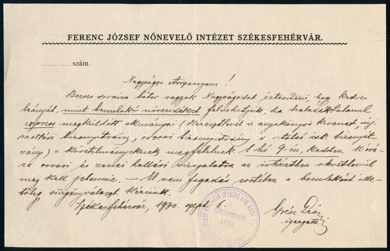 1930 Székesfehérvár, Grész Leó (1883-1945) tanár, ciszterci szerzetes, a Ferenc József Nőnevelő Intézet igazgatójának saját kezű, aláírt levele, az intézet fejléces levélpapírján, bélyegzővel