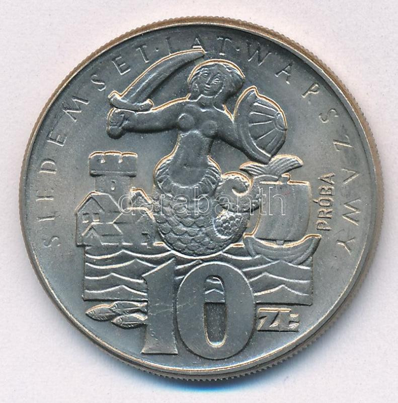 Lengyelország 1965. 10Zl Cu-Ni "700 éves Varsó - Sellő karddal és pajzzsal, háttérben hajó és ház" próbaveret "PRÓBA" jelzéssel T:1