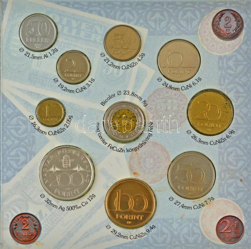 1997. 50f-200Ft (10xklf) "Magyarország pénzérméi" forgalmi sor dísztok... https://www.darabanth.com/hu/445-Gyorsarveres/445.0/Numizmatika/Magyar-forgalmi-sorok~1000010/1997-50f-200Ft-10xklf-Magyarorszag-penzermei-forgalmi-sor-disztokban-A-belso-tok-ragaszt~II2937459