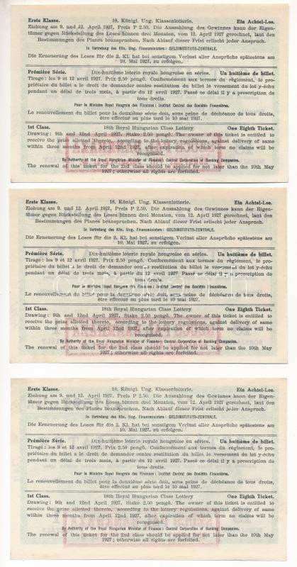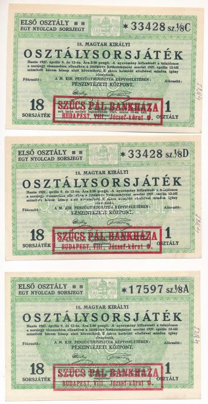 1927. "18. Magyar Királyi Osztálysorsjáték" első osztály 1/8 sorsjegye (3x) közte két darab sorszámkövető "33428 1/8C-33428 1/8D", mindegyik árusítói bélyegzéssel T:AU kis sarokhajlások