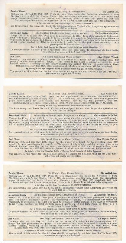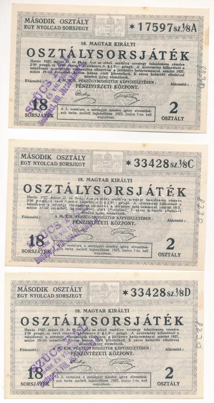 1927. "18. Magyar Királyi Osztálysorsjáték" második osztály 1/8 sorsjegye (3x) közte két darab sorszámkövető "33428 1/8C-33428 1/8D", mindegyik árusítói bélyegzéssel T:AU kis sarokhajlás