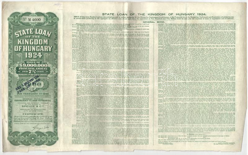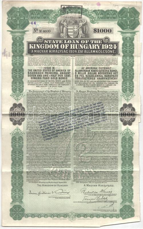 Leírás: Budapest 1924. "A Magyar Királyság 1924. évi államkölcsöne" kötvény 1000$-ról, bélyegzésekkel, angol és magyar nyelven T:F