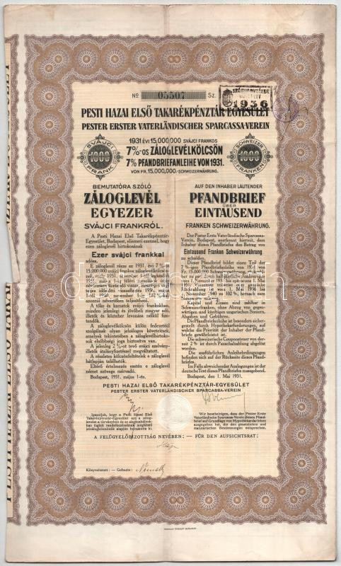 Budapest 1931. "Pesti Hazai Első Takarékpénztár-Egyesület" záloglevele 1000 svájci frankról magyar és német nyelven szárazpecséttel, felülbélyegzéssel T:F