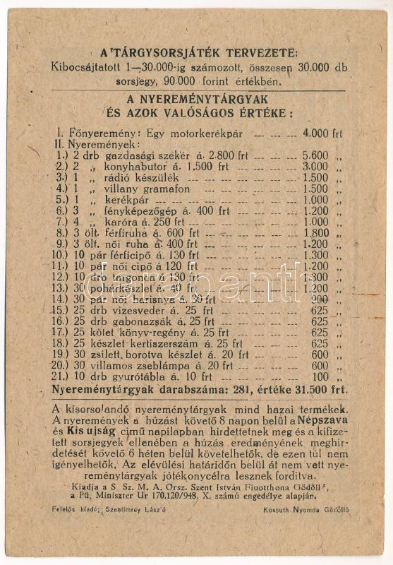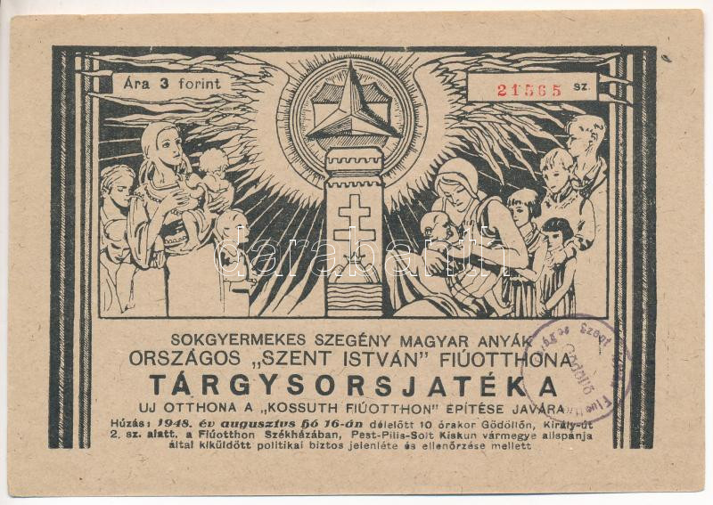 Leírás: Gödöllő 1948. "Sokgyermekes Szegény Magyar Anyák Országos "Szent István" Fiúotthona" tárgysorsjáték sorsjegy a Kossuth Fiúotthon építési javára, 3Ft értékben, "21565" sorszámmal, bélyegzéssel T:AU gemkapocs nyom, apró tűly.