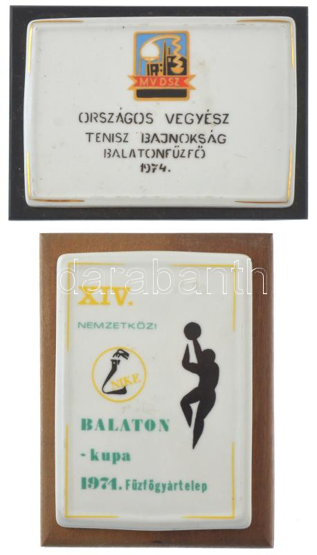 Leírás: 1971. "XIV. Nemzetközi NIKE Balaton-kupa 1971. Fűzfőgyártelep" porcelán plakett fa posztamensen (79x112mm) + 1974. "Országos Vegyész Tenisz Bajnokság Balatonfűzfő 1974" porcelán plakett farost posztamensen (114x79mm) T:AU