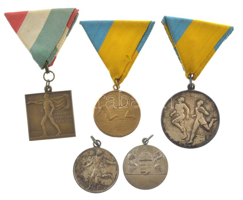 Leírás: ~1930-1940. 5db klf sportérem, közte 1938. "3000M ÖTÖS IFJ. BAJN. CS. III. 1938" bronz díjérem "LUDWIG BP" gyártói jelzéssel, mellszalagon (31x31mm) T:AU