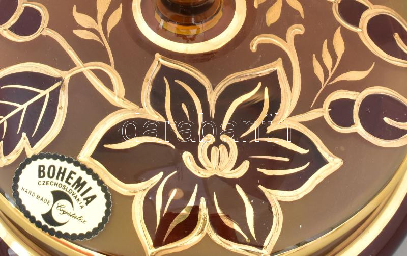 Leírás: Bohemia bonbonier, anyagában színezett, festett és savmaratott fedővel, címkével jelzett, kopással, d: 15 cm