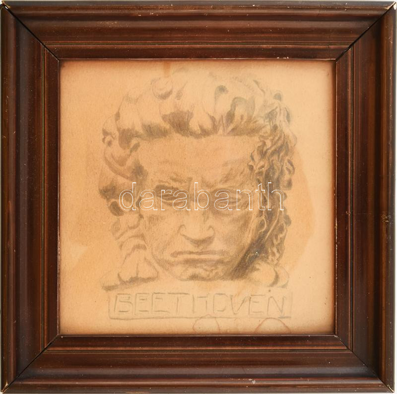 Leírás: Jelzés nélkül, XX. sz. eleje: Beethoven. Ceruza, papír, kissé foltos, üvegezett fakeretben, 13×13 cm