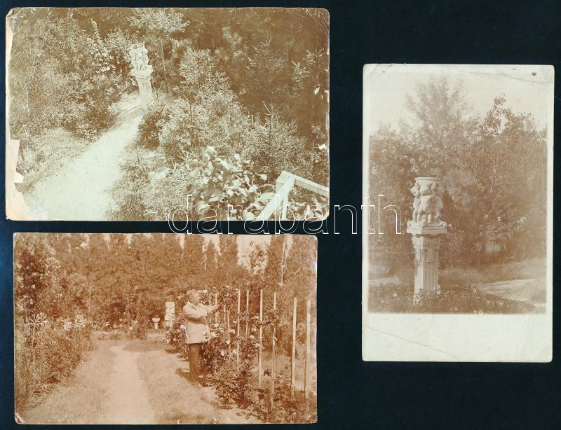 cca 1914-18 össz. 3 db fotó és fotólap a Kézdi-Kovács/Sárdy művészcsalád Rómaifürdőn található villájának kertjéről, egyiken a családfő, Kézdi-Kovács László (1864-1942) festőművész, műkritikus rózsák közt, másikon fia, ifj. Kézdi-Kovács László autográf sorai testvéréhez, Kézdi-Kovács Elemér (1898-1976) későbbi festöművésznek, I. világháborús katonának. Mindegyiken a kertben található puttókkal díszített, részben szecessziós stílusú szobrászművészeti alkotással (díszkúttal?). 2 fotó Sárdy Brutus autográf feliratával és datálásával. Részben kissé sérült (törésnyomokkal). 13,5x9 és 10x15 cm közötti méretekben.