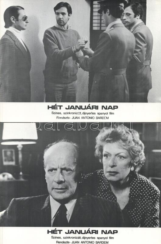 cca 1979 ,,Hét januári nap" című spanyol film jelenetei és szereplői, 6 db produkciós filmfotó nyomdatechnikával sokszorosítva kartonpapírra, egyoldalas nyomással, a használatból eredő (esetleges) kisebb hibákkal, 18x24 cm