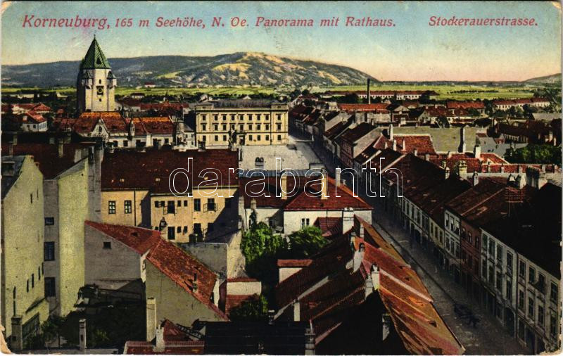 Leírás: 1918 Korneuburg, Panorama mit Rathaus, Stockerauerstrasse / street view, town hall (EK)