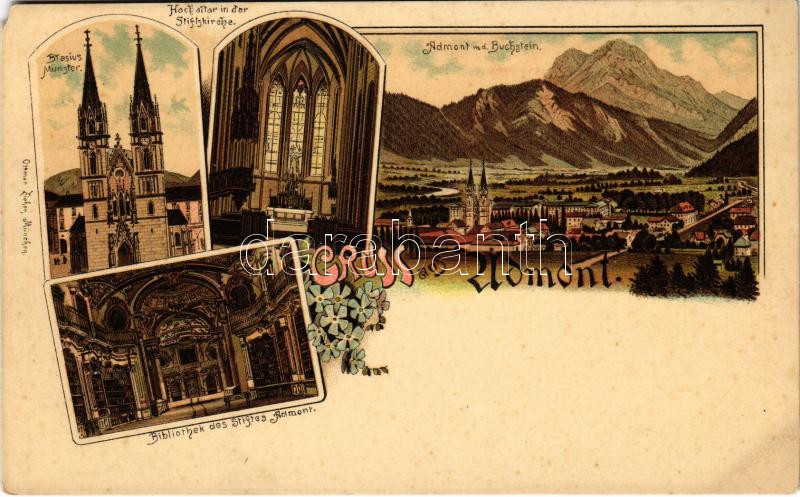 Admont, Brasius Münster, Hochaltar in der Stiftskirche, Bibliothek des Stiftes, Buchstein / church inerior. Ottmar Zieher Art Nouveau, floral, litho (EM)