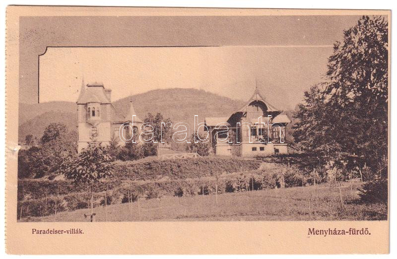 1910 Menyháza-fürdő, Monyásza, Baile Moneasa; Paradeiser villák. Illés... https://www.darabanth.com/hu/446-Gyorsarveres/446.0/Kepeslapok/Erdely~2000007/1910-Menyhaza-furdo-Monyasza-Baile-Moneasa-Paradeiser-villak-Illes-Albert-kiadasa-villa~II2918457