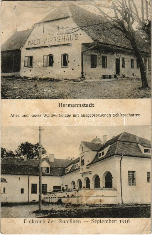 1917 Nagyszeben, Hermannstadt, Sibiu; Einbruch der Rumänen September 1916. Altes und neues Waldwirtshaus mit ausgebrochenen Schiesscharten / Erdei vendéglő a románok csapatok betörése után / WWI forest restaurant after the Romanian invasion. Kunstanstalt Jos. Drotleff Nr. 57. Phot. G. Egel (EB)