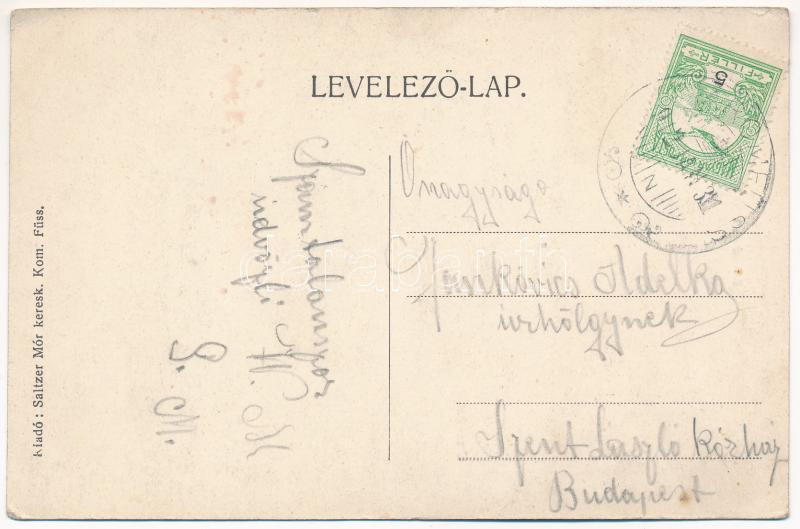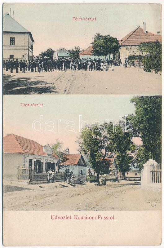 1912 Komáromfüss, Komárom-Füss, Fis, Trávnik; Fő tér, Saltzer Mór vegyeskereskedés üzlete, bor, sör és pálinka mérése és saját kiadása / main square, shop (EK)
