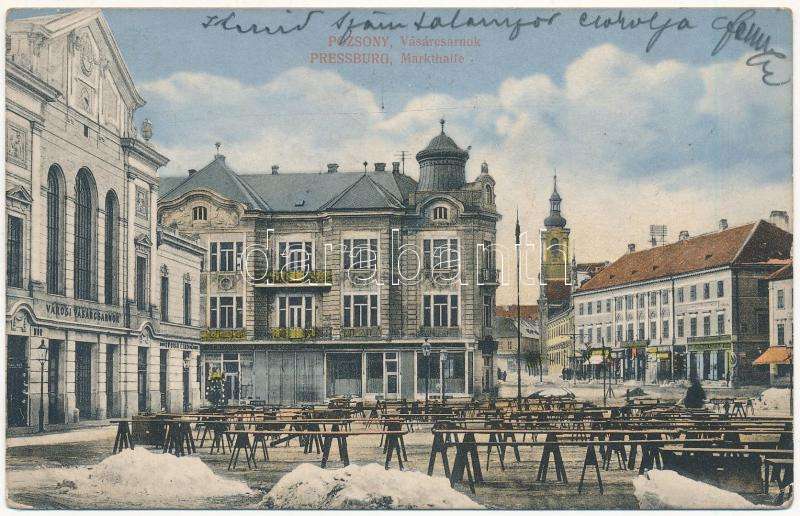 1912 Pozsony, Pressburg, Bratislava; Vásárcsarnok, piac, Dworak Ernő ü... https://www.darabanth.com/hu/446-Gyorsarveres/446.0/Kepeslapok/Felvidek~2000008/1912-Pozsony-Pressburg-Bratislava-Vasarcsarnok-piac-Dworak-Erno-uzlete-Markthalle-marke~II2953574