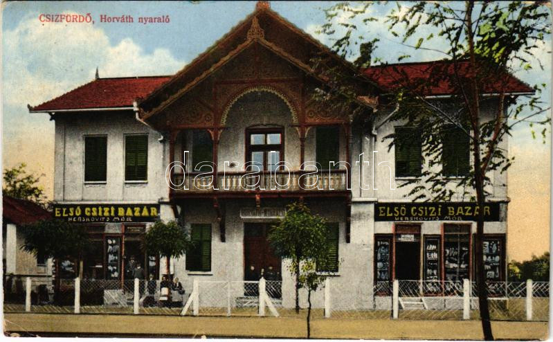 Leírás: 1913 Csíz, Csízfürdő, Kúpele Cíz; Horváth nyaraló, Első Csízi Bazár. Herskovits Mór üzlete és saját kiadása / villa, bazaar, shop (EK)