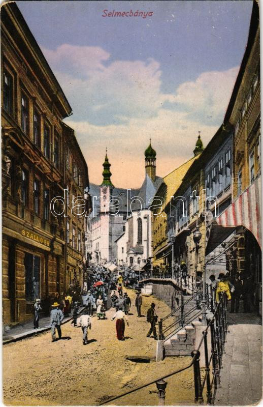 Selmecbánya, Schemnitz, Banská Stiavnica; Deák Ferenc utca, Hungária szálloda és kávéház, Klein Jakab üzlete. Joerges kiadása / street view, hotel and café, shops