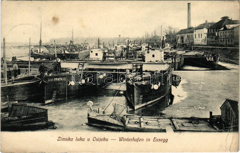 Eszék, Essegg, Osijek; Winterhafen / Zimska luka / Téli kikötő, MFTR uszályok, MÁMT Dráva 1. és 2. - Selzer i Rank 2025. / winter port with ships, barges (EB)
