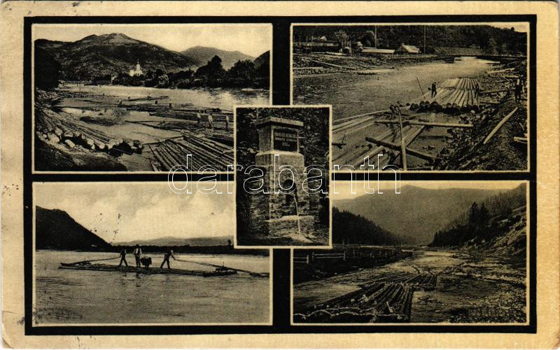 Leírás: 1939 Kőrösmező, Körösmező, Jaszinya, Jasina, Yasinia (Máramaros); Pramen C. Tisy a vory na C. Tise / faszállító tutajosok a Tiszán / timber rafters (ázott sarok / wet corner)