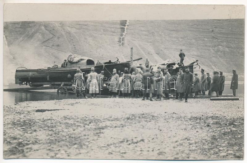 1918 Zaleszczyki (Galicia), osztrák-magyar katonák két motorcsónakot próbálnak a Dnyeszter folyón áttolni / WWI K.u.k. military motor boats pulled by soldiers across Dnister River (Galizien). photo (EK)