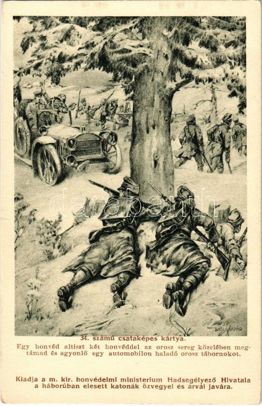 34. számú csataképes kártya. Egy honvéd altiszt két honvéddel az orosz sereg közelében megtámad és agyonlő egy automobilon haladó orosz tábornokot. Kiadja a M. kir. Honvédelmi Minisztérium Hadsegélyező Hivatala / WWI Austro-Hungarian K.u.K. military art postcard, K.u.K. officers kill a Russian general in his automobile s: Basch Árpád