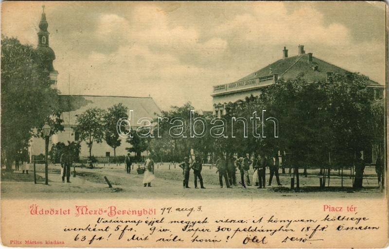 Leírás: 1899 (Vorläufer) Mezőberény, Piac tér, templom, Magyar Király szálloda. Piltz Márton kiadása (Rb)