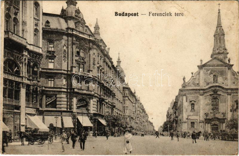 Budapest V. Ferenciek tere, templom, Pension Exquisite, Stein, Mérő I. és társa és Kőszegi H. üzlete, dohány és szivar áruda. Vasúti levelezőlapárusítás 410. (Rb)