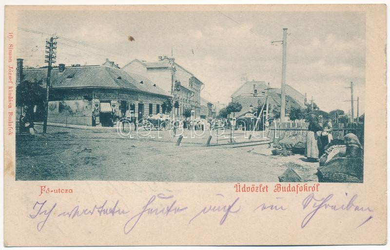 Leírás: Budapest XXII. Budafok, Fő utca és Országút sarok, Oberding József üzlete, villamossín, piac. Ifj. Simon József kiadása