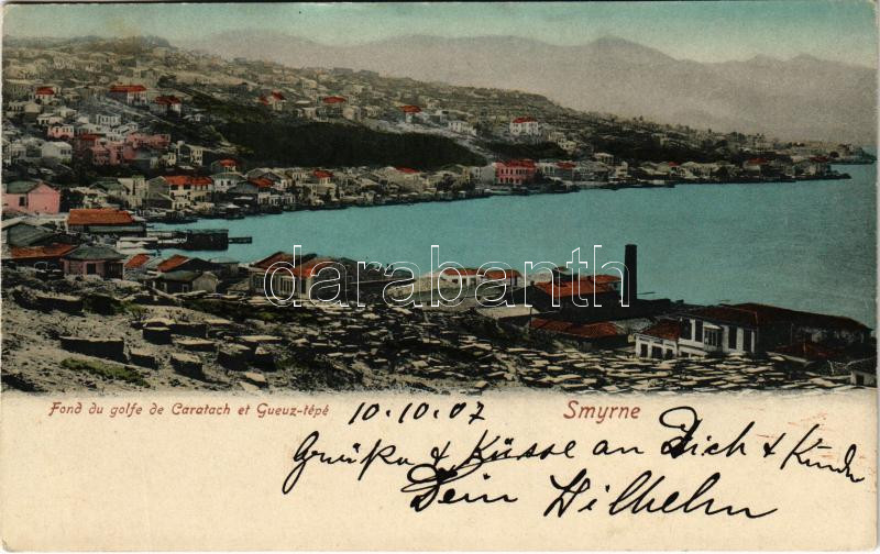 1907 Izmir, Smyrne; Fond du golfe de Caratach et Gueuz-tépé https://www.darabanth.com/hu/446-Gyorsarveres/446.0/Kepeslapok/Torokorszag~2000084/1907-Izmir-Smyrne-Fond-du-golfe-de-Caratach-et-Gueuz-tepe~II2945812