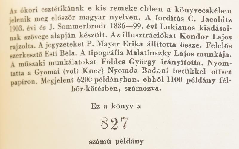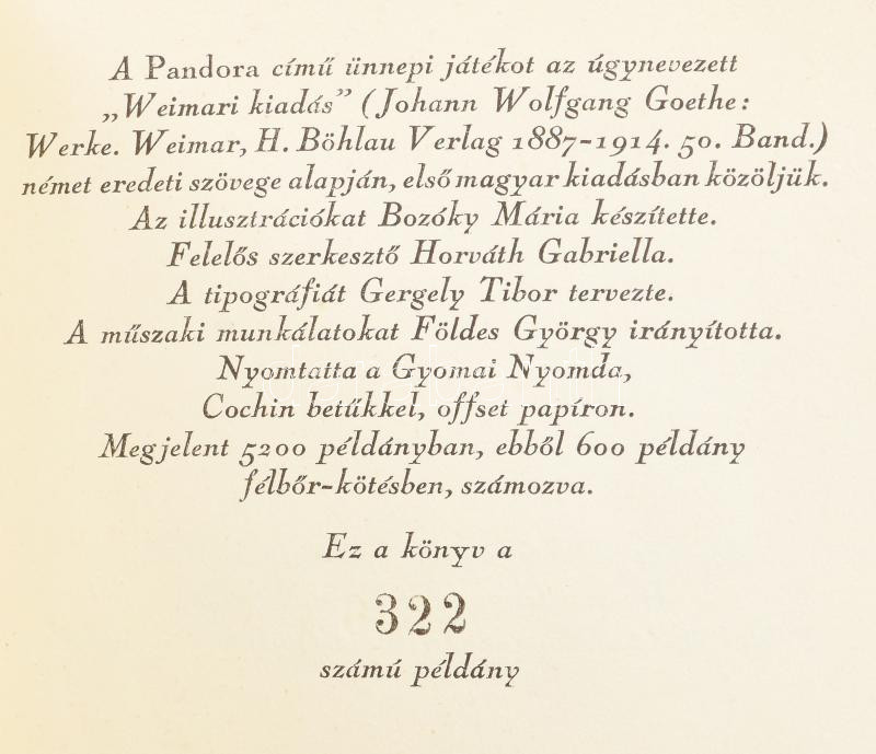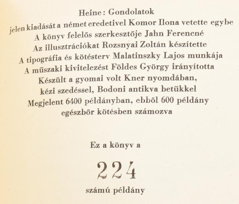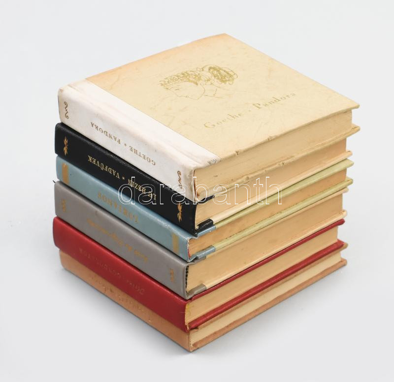 Vegyes könyvtétel a Magyar Helikon kisméretű könyveiből, 6 kötet: Johann Wolfgang Goethe: Pandora. Ünnepi játék. Bozóky Mária illusztrációival.Bp., 1960., Magyar Helikon. Kiadói félbőr-kötés. Számozott (322./600) példány.; Lu Hszin: Vadfüvek. Versek prózában. Fordította, az utószót és a jegyzeteket írta Tőkei Ferenc. Bozóky Mária illusztrációival. Bp., 1961, Magyar Helikon. Kiadói félbőr-kötésben. Számozott példány (218./700) példány.; Lukianos: Beszélgetés a táncról. Ford. és az utószót írta: Trencsényi-Waldapfel Imre. Bp., 1959, Magyar Helikon. Kondor Lajos illusztrációival. Kiadói félbőr-kötésben. Számozott példány (827./1100) példány.; José de Espronceda: A salamancai diák. Ford.: Berczeli A. Károly. Túry Mária illusztrációival. Bp., 1959, Magyar Helikon. Kiadói félbőr-kötésben. Számozott példány (298./1100) példány.; Heinrich Heine: Gondolatok. Ford.: Bíró Sándor. Rozsnyai Zoltán illusztrációival. Bp., 1958, Magyar Helikon. Kiadói félbőr-kötésben. Számozott példány (224./600) példány.; Jacques Gaucheron: A lyoni selyemszövők. Ford.: Gereblyés László. Bartha László illusztrációival. Bp., 1959, Magyar Helikon. Kiadói egészvászon-kötésben.