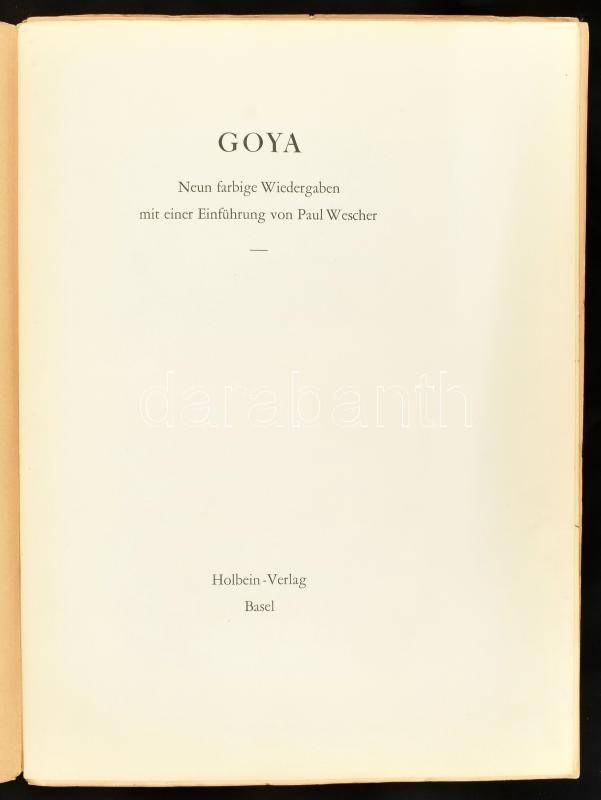 Goya. Neun farbige Wiedergaben mit einer Einführung von Paul Wescher. Basel, 1943, Holbein-Verlag, 6 p.+7 t.+(2) p. Szövegközi és egészoldalas, színes reprodukciókkal illusztrálva. Német nyelven. Sérült kartonmappában, az egyik képtábla kissé foltos, a lap széle kissé sérült.