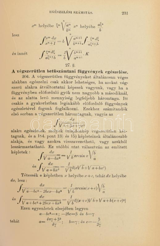 Vész János Ármin: A felsőbb mennyiségtan alapvonalai. I. rész: Különbzéki és egészleti számitás. Bp., 1881, Lampel Róbert (Wodianer F.), (6)+II+408 p. + IV (kihajtható) t. Második kiadás. Kiadói papírkötés, sérült, viseltes állapotban, a 385-408. oldalak, a táblák és a hátsó borító elváltak a könyvtesttől.