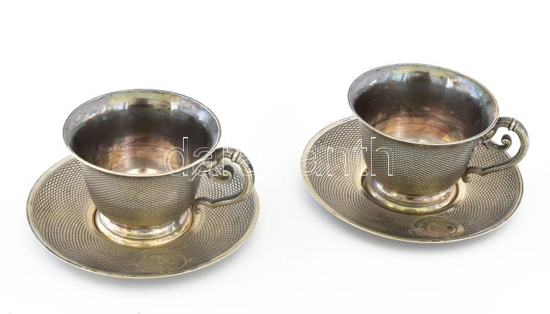 Leírás: 2 db alpakka mokkás csésze monogramos csészealjjal, kis kopásnyomokkal