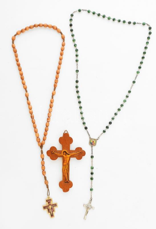 Leírás: 3 darab kegytárgy: 2 rózsafüzér + fa feszület, szép állapotban
