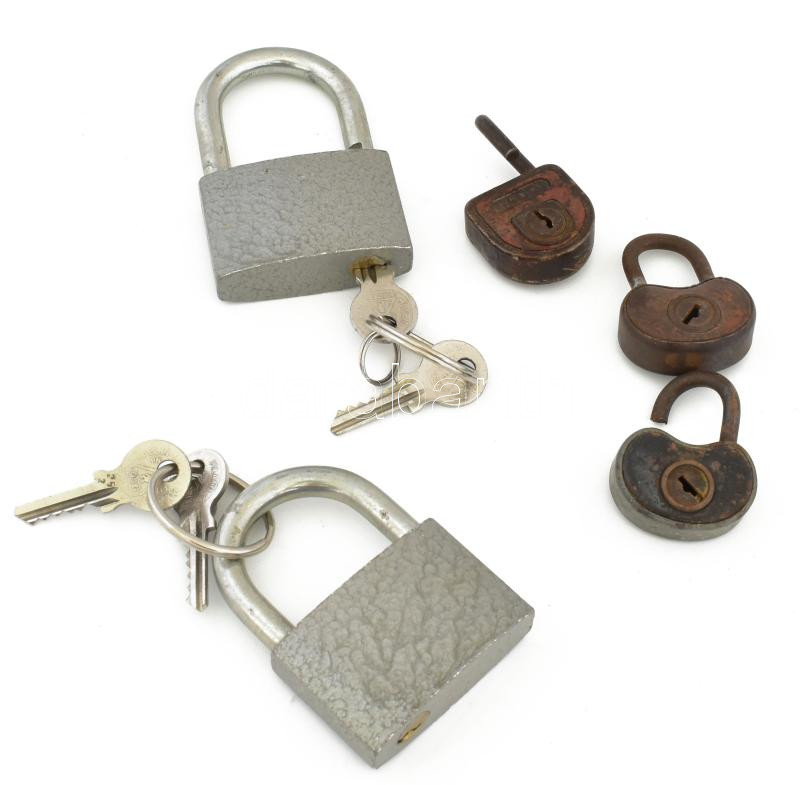 Leírás: 5 darab régi lakat, közte kulccsal is